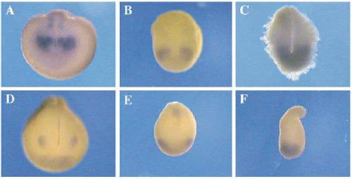 Fig. 8. Effects of prechordal mesoderm removal on retina field resolution in Xenopus embryonic explants. (A) A control embryo hybridized with Pax-6 at st. 18. (B) Pax-6 expression in a control anterior neural plate explant with the underlying mesoderm, showing two separate primordia by st. 18. (C) Pax-6 expression in a st. 18 explant of the anterior neural plate without the underlying mesoderm. Note the retina field did not resolve into two separate primordia. (D) A control embryo hybridized with ET at st. 18. (E) ET expression in a st. 18 control explant with the prechordal mesoderm. (F) ET expression in a st. 18 explant without prechordal mesoderm. |
