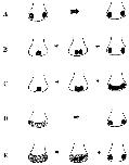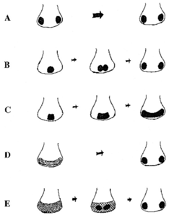Fig. 1. Models for retina primordium formation in vertebrate embryos. The outline illustrates the boundary of the neural plate and the filled circles represent retina primordia. (A) The two separate retina primordia model. (B) A diagram of Stockardâs model of how a single primordium spreads and separates into two retinae. Some of Stockardâs results were directly contradicted by later studies of Adelmann (1929a,b). (C) This is essentially the same as Figs 1, 2 and 4 of LePlat (1919). (D) A schematic representation of Adelmannâs model. It was not determined whether midline cells could migrate laterally. (E) An illustration of the forebrain field model. Eyes are presumably the default fate of this field (Corner, 1966; Boterenbrood, 1970). |