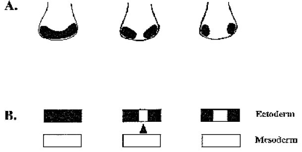 Fig. 11. Retina primordium formation in vertebrate embryos. (A) Our model of retina field development. Dorsal views of the anterior neural plate are illustrated here. There is initially a single retina morphogenetic field in the anterior neural plate of vertebrate embryos. Retina formation is suppressed in its median region, resulting in the resolution of the retina field into two retina primordia. (B) The prechordal plate provides a primary signal for retina field resolution. These are transverse section views of the anterior neural plate and its underlying prechordal mesoderm. Experiments reported here demonstrate a role for the prechordal plate while those performed in zebrafish embryos suggest the midline of the neural plate also plays a role (Hatta et al., 1991, 1994; Hatta, 1992; Macdonald et al., 1995; Ekker et al., 1995b). |