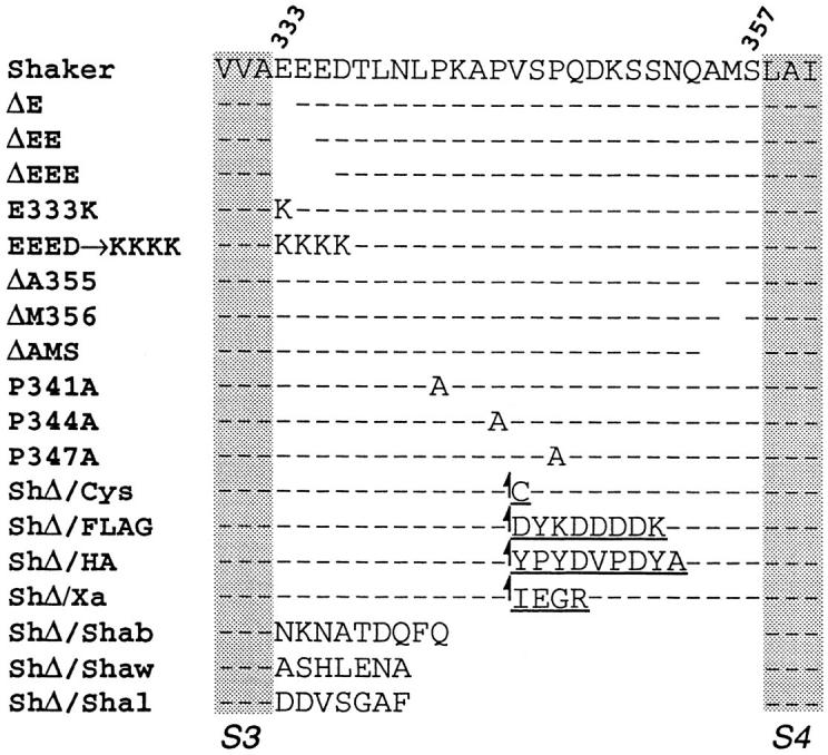 Figure 2. Mutations of the Shaker S3-S4 region. The wild-type