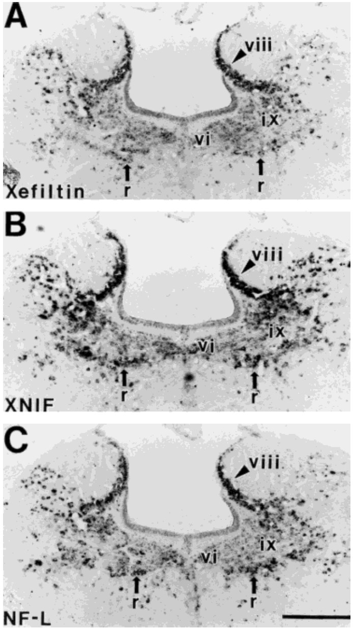 Fig. 5. Expression of xefiltin (A), XNIF (B) and NF-L (C) transcripts