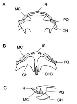 FIG. 3. Whole mount in situ hybridization pattern of Xbap [cc: now called nkx3-1] (A, B, C, D, E, and F) and gsc (G, H, I, J, and K) and Alcian blue staining to visualize cartilage (L). All embryos were photographed at 701 magnification except for (D) at 601. (A) Lateral view of a stage 36 embryo showing both regions of facial staining and the region of gut expression (indicated by g in the figure). (B) Anterior view of the embryo pictured in (A). The paired anterior regions of expression lie on either side of the future mouth opening (M). (C) Dorsal view of a stage 37 embryo showing the forked appearance of the Xbap staining. (D) Lateral view of the left side of a stage 42 embryo showing staining of the anteriorgut tube and facial staining. (E) Dorsal view of a stage 40 embryo. Xbap staining now marks crescent-shaped regions on either side of the future mouth opening (M). (F) Dorsal view of the embryo shown in (D). The region of staining corresponding to the palatoquadratecartilage (PQ) is indicated. (G) Lateral view of a stage 36 embryo showing gsc expression in the face. (H) Anterior view of the embryo pictured in (G). Compare the gsc staining pattern with that of Xbap in (B) and note the vertical nature of the bilateral patches of staining and the broad domain of expression of the midline staining. (I) Dorsal view of the embryo shown in G and H. (J) Lateral view of a stage 42 embryo stained for gsc transcript. (K) Dorsal view of the embryo pictured in J showing the convergence of the gsc staining at the embryonic midline. (L) Ventral view of the head of a stage 43 embryo stained for cartilage. Compare the location of the palatoquadratecartilage (PQ) with that of Xbap staining in similar stage embryos (E and F). Meckel cartilage (MC), ceratohyalcartilage (CH), and basihyobranchialcartilage (BHB) are also shown.