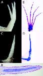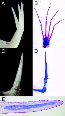 Figure 1. A: A normal forelimb of the Xenopus froglet. B: The autopodium of a normal hand. Well-developed diaphysis stained with alizarin red and epiphysis stained with alcian blue were observable. Two to three joints are formed. C: A cone-shaped hypomorphic structure formed on the forelimb at 5 weeks after amputation. This was the spike formation. D: The spike was stained with alcian blue. This shows that the spike consists of a single continuous cartilage. (E) A section of the spike that was formed on the forelimb at 5 weeks after amputation. Lines indicate the amputation level.