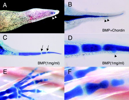 Figure 5. A: BMP4-soaked beads were implanted into the spike. B: The spike in which BMP4/Chordin-soaked beads were implanted was not segmented. C: Segmented skeletal elements that were formed by implantation of BMP4 beads at 1 mg/ml concentration. Whole mount alcian blue staining. Arrows indicate the segmentation, joint-like region. D: Enlarged view of C. E: Normal joint of st57 hindlimb bud. F: Enlarged view of E. Arrowheads indicate beads.