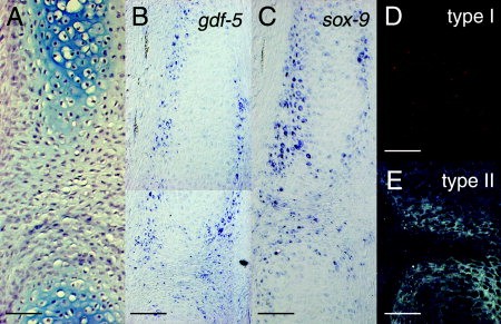 Figure 7. A: Histological analysis of a segmented spike. The section was stained with alcian blue, eosin, and hematoxylin. B,C: Analysis of molecular markers in the BMP4-implanted spike by section in situ hybridization. B: Gdf-5 expression. Although gdf-5 expression was still observed in the peripheral cartilage, remarkable expression was not observed in the joint-like region. C: sox-9 expression. Sox-9 transcriptions were detectable in the joint-like region. D,E: Immunoreactivity for type I and type II collagen. E: Decrease in the signals of type II collagen was observed in the joint-like region. Scale bar = 200 μm.