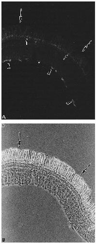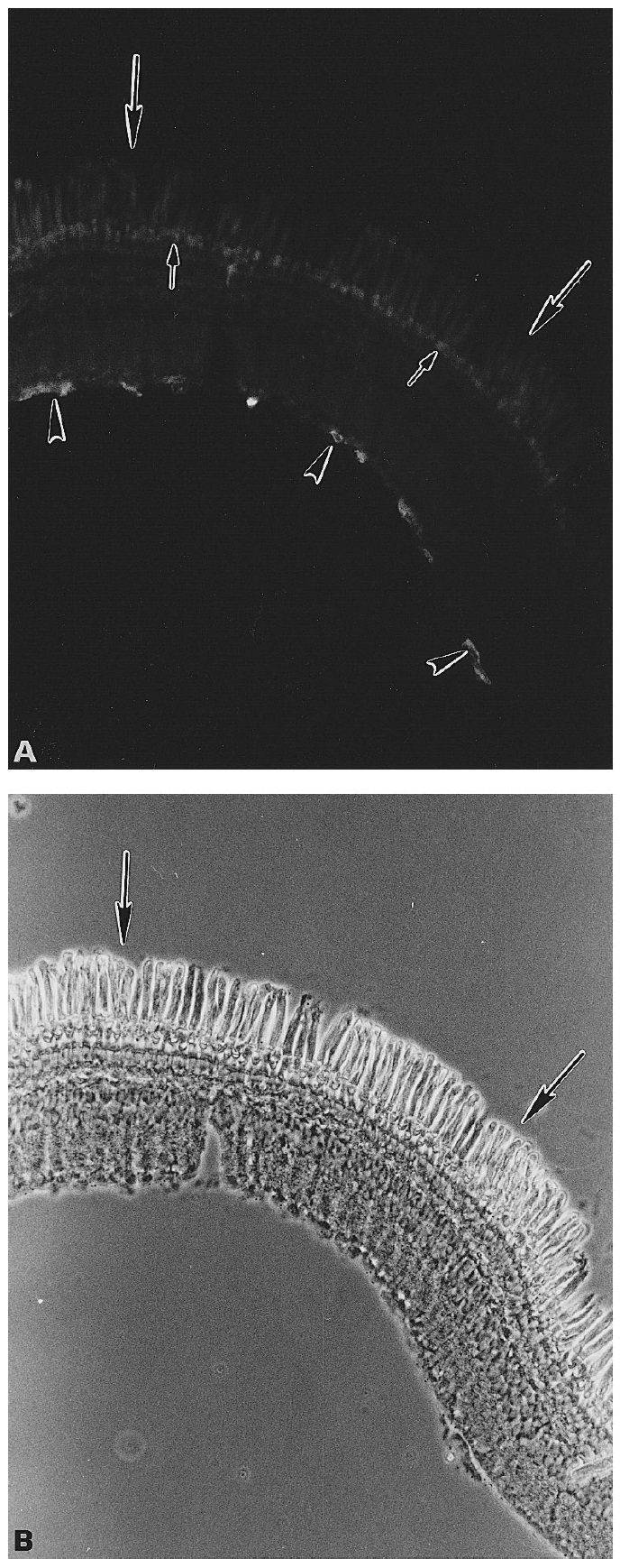 arrowheads) is particularly evident on its apical (free) surface. (B) Phase contrast image of (A). (C) Control showing lack of