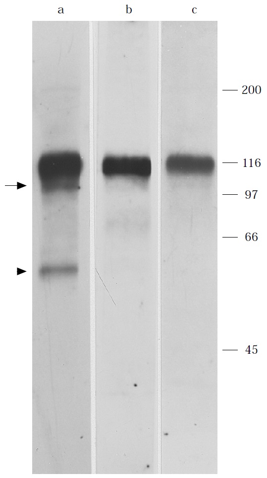 Fig. 1. Western blot analysis using pAb No. 3818 (a), pAb