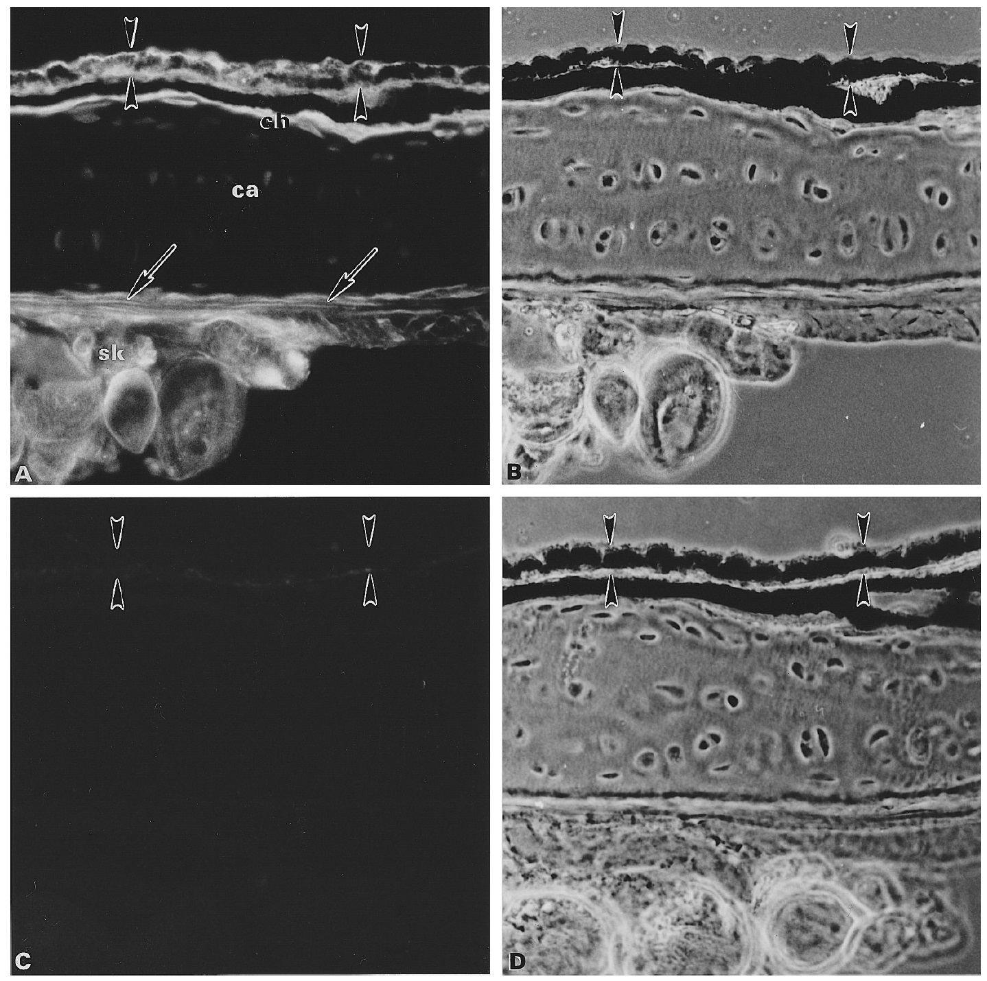 endothelial cells) (ch), while reaction with scleral cartilage (ca) is relatively weak. Labeling of the pigment epithelium (between