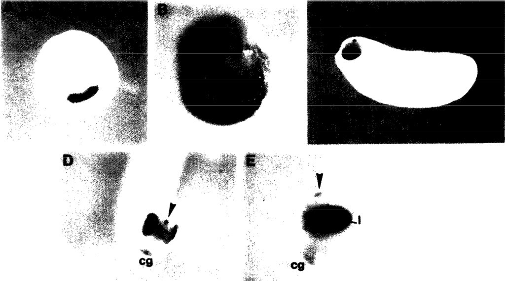 (E) Frontal view of a stage 23 pigmented embryo that was injected with 100 pg of Xwnt-8 synthetic RNA in a ventral-vegetal position at 4 cell stage, showing three eyes with Xrx1 hybridization signal (arrowheads) and two cement glands (arrows).