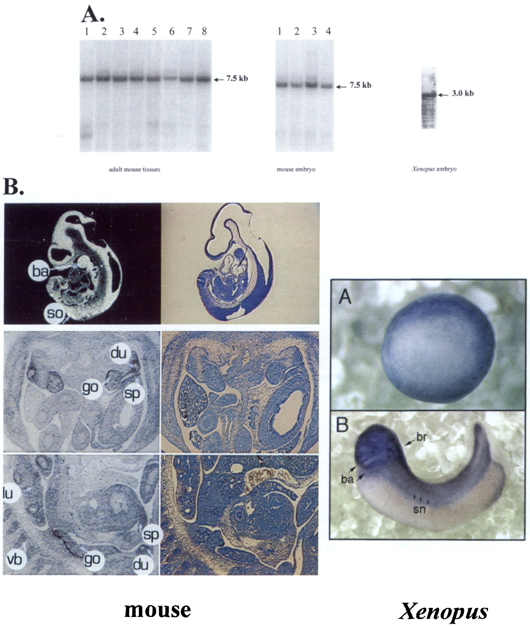 Fig. 2. A. Northern blot analysis of poly-A RNA isolated from multiple tissues from the adult mouse (left panel) and mouse embryo (middle panel) and