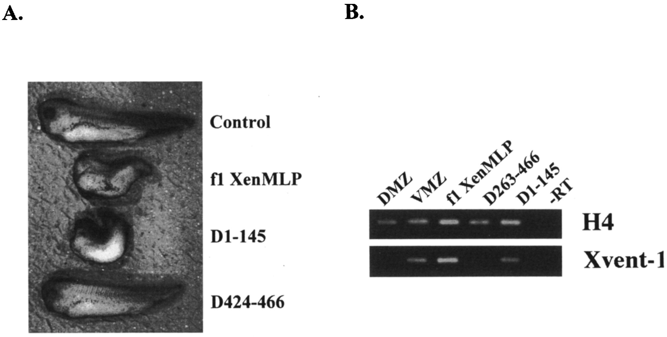 Fig. 5. The C-terminal domain of XenMLP is required and sufficient for biological activity. A. Phenotype of embryos microinjected at the 4-cell stage