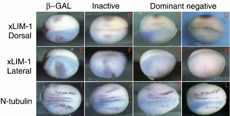 Fig. 4. Retinoid signaling is required for neuronal differentiation. Markers of both neural position and neuronal differentiation were employed to evaluate requirements for xRAR signaling. In situ hybridization analysis of stage 16 embryos (A-H) Xlim-1 (Taira et al., 1992), (I-L) N- tubulin (Chitnis et al., 1995).