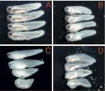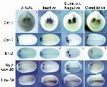 Fig. 2. Constitutively active and dominant negative xRARα have apparently opposite effects on embryonic pattern formation. Wild- type and mutant xRAR mRNAs were evaluated for their ability to alter morphology along the A/P axis. Injections or treatments were as follows: (A) uninjected, (B) xRARα1405*, (C) VP16-xRARα1, (D) 10−7 M tRA. mRNAs were injected bilaterally at the two-cell stage and the embryos allowed to develop until fixation at stage 38-40. Microinjections were performed with both α1 and α2 dominant negative receptors. The strongest and most consistent phenotypes were elicited by xRARα1405* and this receptor was utilized for subsequent studies.