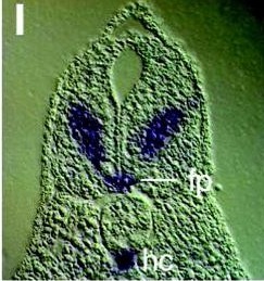 mnt (MAX network transcriptional repressor ) gene expression in Xenopus laevis embryo, assayed via in situ hybridization, NF stage 27, sagittal section through head region, anterior left. |