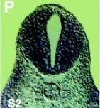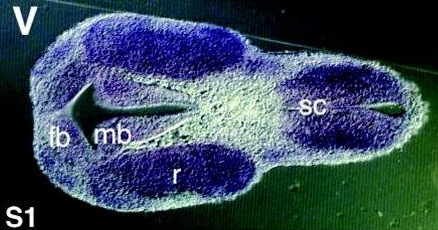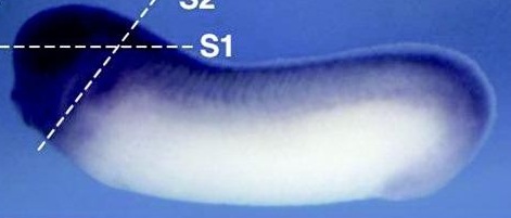 Figure 3. Spatial expression pattern of Xmad1, Xmad3, and Xmnt in Xenopus embryos. (A-I) Xmad1, (J-P) Xmad3, and (Q-W) Xmnt. (A) Stage 6.5 lat., (B) stage 10 veg., (C) stage 11 veg., (D) stage 13 d., (E) stage 17 ant., (F) stage 17, transversal section, (G) stage 19, (H) stage 27, (I) stage 27, transversal section, (J) stage 20 d., (K) stage 20 lat., (L) stage 23 ant., (M) stage 23 d., (N) stage 29, (O) transversal section S1 of N, (P) transversal section S2 of N, (Q) stage 19 ant., (R) stage 19 d., (S) stage 20 lat., (T) stage 23 lat., (U) stage 27, (V) stage 27 sagittal section S1, and (W) stage 27 transversal section S2. anp, anterior neural plate; b, branchial crest segment; cg, cement gland; d, dorsal; ev, eye vesicle; fb, forebrain; fp, floor plate; h, hyoid crest segment; hb, hindbrain; hc, hypochord; lat, lateral; mz marginal zone; nc, notochord; nt, neural tube; veg, vegetal; mb, midbrain; op, olfactory placode; otic vesicle; P, pronephros; pg, pineal gland; sc, spinal chord; r, retina; V, trigeminal ganglion; VII, geniculate ganglion. The dashed line indicates the plane of the section. |