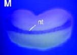 mnt (MAX network transcriptional repressor) gene expression in Xenopus laevis embryo, assayed via in situ hybridization, NF stage 19, anterior view, dorsal up. |