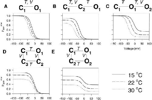The chloride channel from the Torpedo electric organ, ClC-0, is the best studied member of a large gene-family (Jentsch, T.J. 1996. Curr. Opin. Neurobiol. 6:303-310.). We investigate the temperature dependence of both the voltage- and chloride-dependent fast gate and of the slow gate of the "double-barreled" ClC-0 expressed in Xenopus oocytes. Kinetics of the fast gate exhibit only a moderate temperature dependence with a Q10 of 2.2. Steady-state P(open) of the fast gate is relatively independent of temperature. The slow gate, in contrast, is highly temperature sensitive. Deactivation kinetics at positive voltages are associated with a Q10 of approximately 40. Steady-state open probability of the slow gate (P(open)slow(V)) can be described by a Boltzmann distribution with an apparent gating valence of approximately 2 and a variable "offset" at positive voltages. We note a positive correlation of this offset (i.e., the fraction of channels that are not closed by the slow gate) with the amount of expression. This offset is also highly temperature sensitive, being drastically decreased at high temperatures. Paradoxically, the maximum degree of activation of the slow gate also decreases at higher temperatures. The strong temperature dependence of the slow gate was also observed at the single channel level in inside-out patches. The results imply that within a Markovian-type description at least two open and two closed states are needed to describe slow gating. The strong temperature dependence of the slow gate explains the phenotype of several ClC-0 point-mutants described recently by Ludewig et al. (Ludewig, U., T.J. Jentsch, and M. Pusch. 1996. J. Physiol. (Lond.). In press). The large Q10 of slow gating kinetics points to a complex rearrangement. This, together with the correlation of the fraction of noninactivating channels with the amount of expression and the fact that the slow gate closes both protochannels simultaneously suggests that the slow gate is coupled to subunit interaction of the multimeric ClC-0 channel.