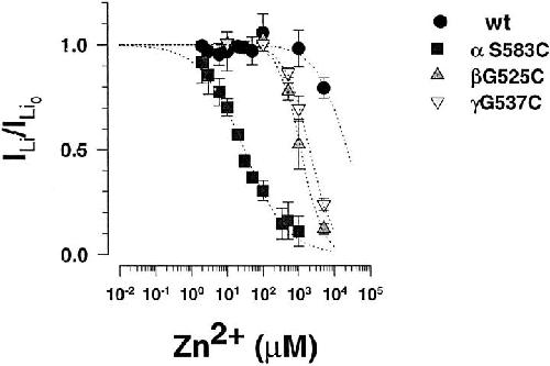 Figure 6. Block of wt ENaC and mutants by external Zn2+. Concentration dependence of Zn2+ inhibition of inward Li+current. I/I0represents the current ratio measured in the presence/absence of external Zn2+. Inhibitory constants (Ki) were obtained from best fit of the data to a Langmuir inhibition isotherm (dotted lines). Zn2+ Ki were >10 mM for wt ENaC (n = 34), 29 μM for αS583C (n = 42), 1.1 mM for βG525C (n = 10), and 1.9 mM for γG537C (n = 14). |