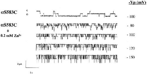 Figure 7. Single channel recording of αS583C mutant in absence or with 0.2 mM Zn2+in the external solution. In the presence of Zn2+ channel activity (n · Po) was 0.64 at −80 mV, 0.46 at −100 mV, 0.44 at −120 mV, and 0.35 at −150 mV. |