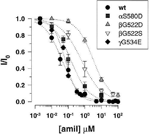 Figure 10. Decreased sensitivity of βG522D mutant to amiloride. Dose-dependent inhibition of Li+current by amiloride. Inhibitory constants (Ki) obtained from fit of the data to inhibition Langmuir isotherm were 0.14 μM for αS580D (n = 12), 0.06 μM for γG534E (n = 8), 3.4 μM for βG522D (n = 16), and 0.6 μM for βG522S (n = 10). |