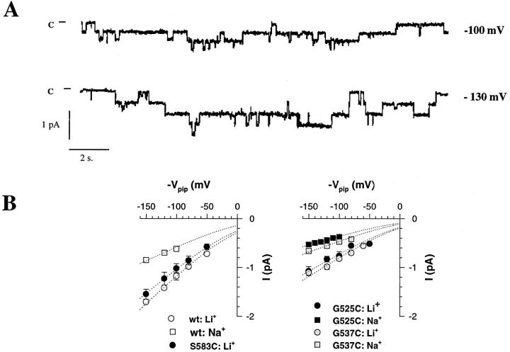 Figure 4. Effects of introducing Cys residues in pre M2 segment at positions αS583, βG525, and γG537. (A) Single channel tracings of βG525C mutant recorded with Na+as permeating ion. (B) Left: I-V relationships of wt ENaC and αS583C mutant. Cord conductance for wt ENaC (wt) in the presence of Na+was 5.1 and 10 pS with Li+. Li+conductance of αS583C was 8.9 pS. Right: I-V relationships for βG525C and γG537C. In the presence of Na+and Li+ions, cord conductances were, respectively, 3.2 and 5.8 pS for βG525C, 4 and 6.23 pS for γG534C. Dotted lines represent fit of the data of the I-V relationships according to the constant field equation. Each point represents mean value of two to five channels. |