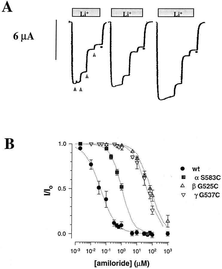 Figure 5. Amiloride sensitivity of αβγ Cys mutants. (A) Original tracings of amiloride inhibition of inward Li+current in oocytes expressing βG525C mutant together with α and γ subunits. Triangles (▴) represent addition of external amiloride at increasing concentrations of 0.1, 10, 70, and 100 μM, and • indicates return to the starting K solution. (B) Titration curve of Li+current by amiloride. I/I0 is the ratio of blocked over unblocked Li+current. Li+ current was measured in individual oocytes in the presence of four different amiloride concentrations (wt-ENaC, n = 82; αS583C, n = 27; βG525C, n = 59; γG537C, n = 14) Dotted lines represent fit of data to a Langmuir inhibition isotherm (see materials and methods). |