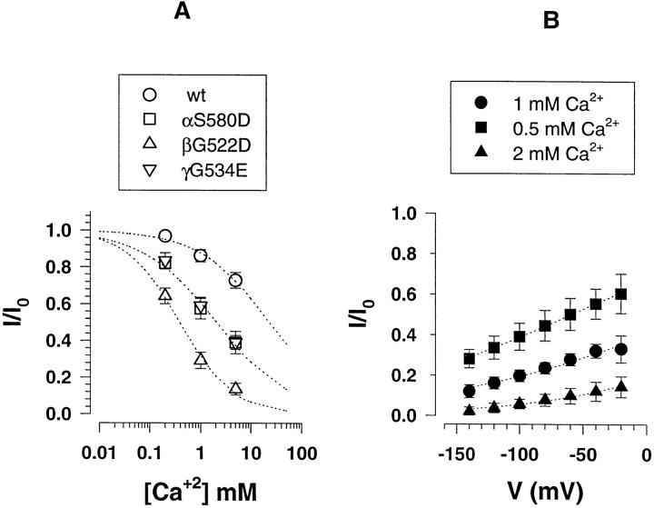Figure 9. Block of αS580D, βG522D, γG534E mutants by external Ca2+. Mutant subunits were coexpressed with α, γ wild-type subunits. (A) Concentration dependence of inhibition of Li+current by external Ca2+. The ratio I/I0 represents the measured ILiin the presence/absence of external Ca2+ions. Ca2+ inhibitory constants (Ki) obtained from fit to inhibition Langmuir isotherm (dotted lines) were 2.1 mM for the αS580D (n = 8), 0.4 mM for βG522D (n = 10), and 2.2 mM for γG534E (n = 8). (B) Voltage dependence of βG522D mutant block by external Ca2+ at concentrations of 0.5, 1, and 2 mM (n = 4). Dotted lines represent fit of the data to Eq. 2 (see materials and methods) gave Ki(0) values of 0.67, 0.97, and 0.49, z′ values of 0.26, 0.28, and 0.35 for the experiments done with respectively 0.5, 1, and 2mM Ca2+. |