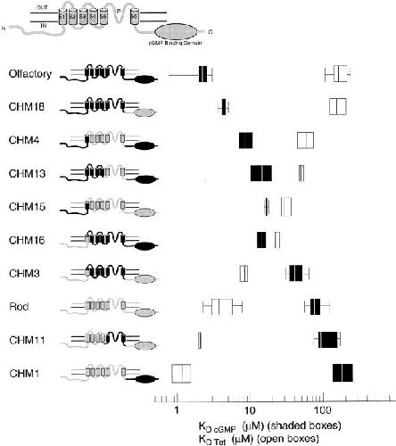 Figure 2. The KD cGMP for cGMP and the KD Tet for tetracaine are inversely correlated for a number of rod-olfactory channel chimeras. KD cGMP's for cGMP are indicated by shaded boxes. KD Tet's for tetracaine are indicated by open boxes. Values for KD Tetwere obtained from fits to the Michaelis-Menten equation and values for KD cGMP were obtained from fits to the Hill Equation (see Results). KD cGMPis defined as the concentration of cGMP which produces half the current seen at saturating cGMP. KD Tet is defined as the concentration of tetracaine that blocks half the current at saturating cGMP. In this box plot, the left and right edges of the boxes shows the 25th and 75thpercentiles of the data. The whiskers coming out of some of the boxes show the 5th and 95th percentiles. The line in the middle of the boxes shows the median.