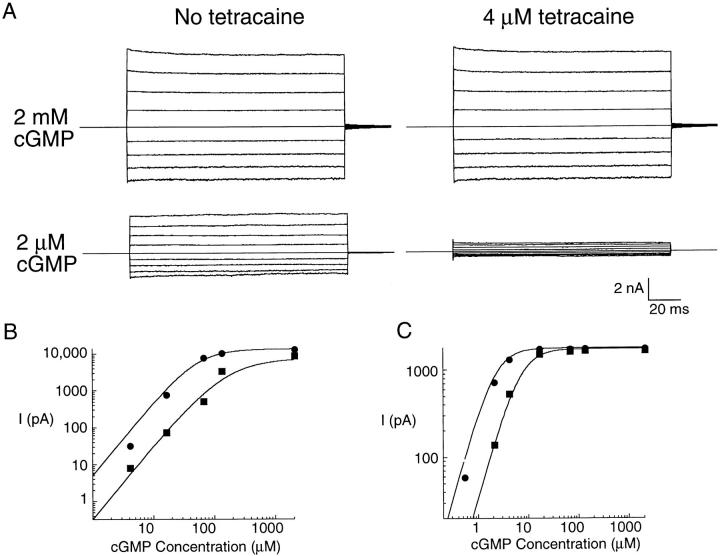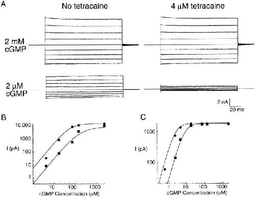 Figure 4. Tetracaine becomes a more effective blocker at low concentrations of cGMP. (A) Current traces recorded from the olfactory channel. All traces were recorded from the same patch. The top set of traces shows currents recorded at saturating cGMP in the presence and absence of 4 μM tetracaine. The bottom set of traces shows currents recorded at 2 μM cGMP in the presence and absence of 4 μM tetracaine. (B and C) cGMP dose-response curves for the rod (B) and olfactory (C) channels in the presence (squares) and absence (circles) of 4 μM tetracaine. Currents recorded at +60 mV. The curves are generated from the model in Fig. 3 A with the following parameters: for the rod channel, K = 4,500 M−1, L = 17, KDc = 280 nM, KDo = 185 μM, ISat cGMP = 13,630 pA. For the olfactory channel: K = 4,500 M−1, L = 30000, KDc = 440 nM, KDo = 185 μM, ISat cGMP= 1,781 pA. All currents were measured at +60 mV.