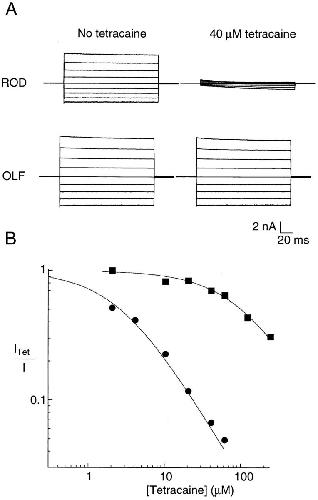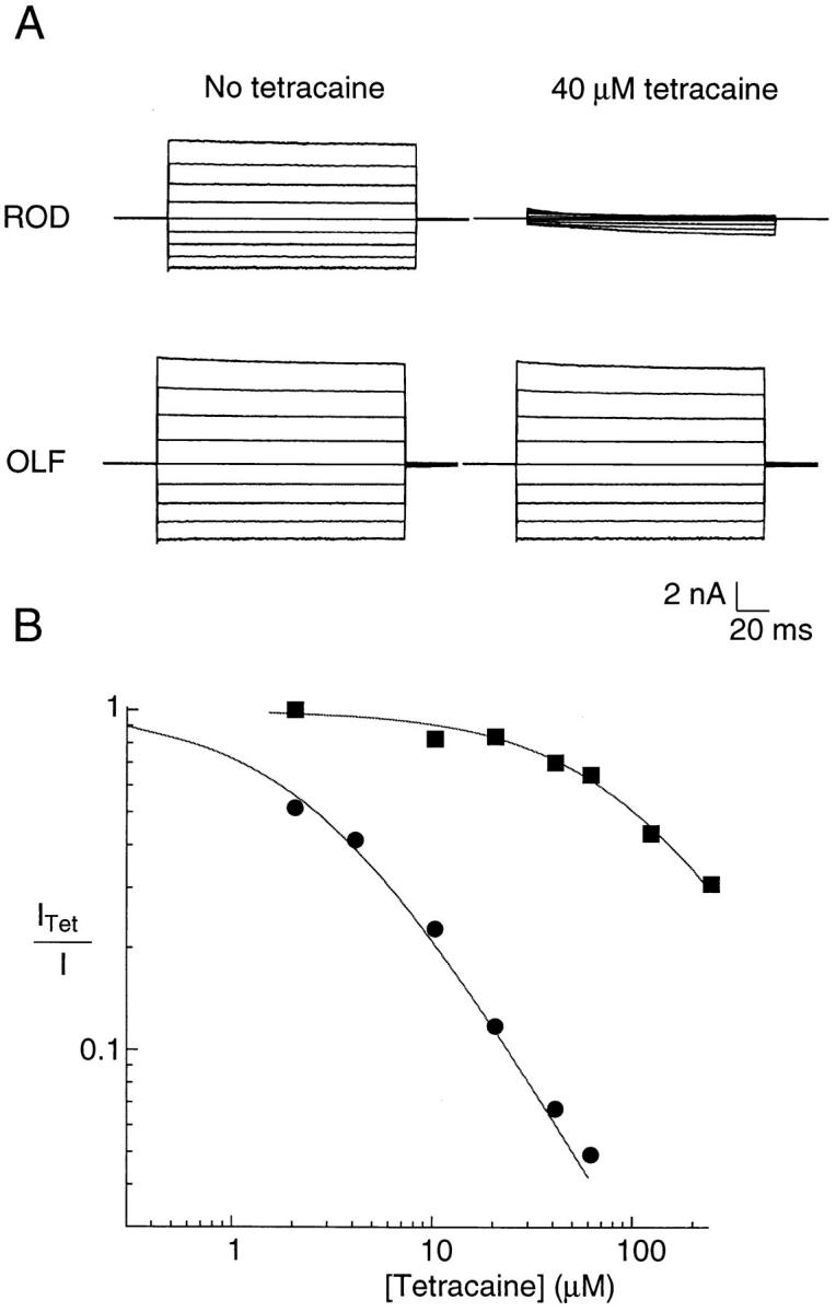 Figure 1. At saturating cGMP, tetracaine effectively blocks the rod but not the olfactory channel. (A) Current families are recorded in response to voltage steps from 0 mV to between −80 and +80 mV in 20-mV steps. The top set of traces are from the bovine rod channel and the bottom set of traces are from the rat olfactory channel. All currents were recorded in the presence of 2 mM cGMP. The left traces are in the absence of tetracaine and the right traces are in identical solutions with 40 μM tetracaine. (B) Dose- response curves for tetracaine block. Circles represent data from the rod channel and squares from the olfactory channel. Smooth curves are fits to the data with the Michaelis-Menten equation (see results) with KD Tet = 2.63 μM for the rod channel and KD Tet = 102.4 μM for the olfactory channel. All currents were measured at +60 mV.