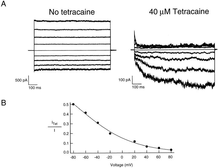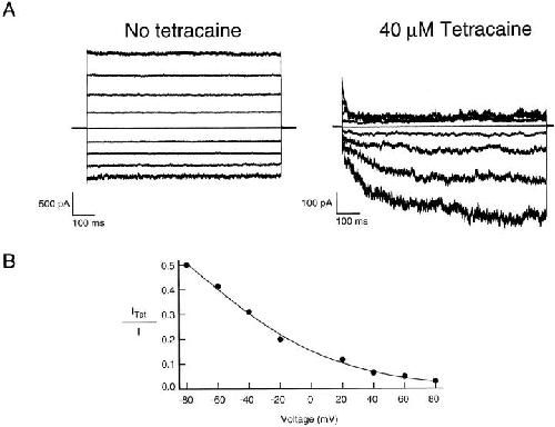 Figure 8. The voltage dependence of tetracaine block. (A) Current families recorded from the rod channels in the presence of saturating cGMP (2 mM) in response to voltage steps from 0 mV to between −80 and +80 mV in 20 mV steps. In these recordings, the duration of each voltage step was extended to 800 ms in order to allow currents from hyperpolarized voltages to achieve steady state. All data were recorded from the same patch. (B) The current in the presence of 40 μM tetracaine at each voltage was normalized by the current recorded in the absence of tetracaine at that voltage. The curve is a fit from the model in Fig. 3 A except that KDc was replaced with an expression that varied with voltage (see results). Parameters from the fit are KDc-0 = 365 nM, zδ = 0.56 and L = 20.