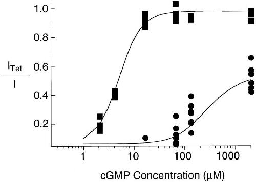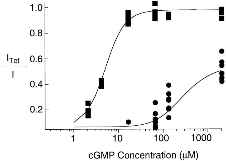 Figure 5. The effect of 4 μM tetracaine at different concentrations of cGMP for a number of different patches containing rod (circles, N = 7) and olfactory (squares, N = 4) channels. On the abscissa is the current recorded with 4 μM tetracaine normalized by the current recorded without tetracaine at the concentration of cGMP indicated on the ordinate. Curves are fits from the model shown in Fig. 3 A with the following parameters: K = 4,500 M−1, LROD = 17, LOLF = 30000, KDc = 280 nM and KDo = 180 μM. All currents were measured at +60 mV.