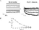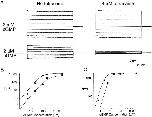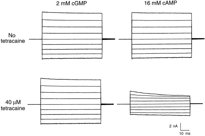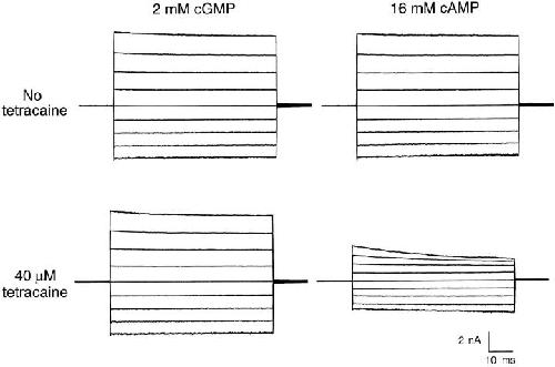 Figure 6. For olfactory channels, 40 μM tetracaine is more effective at blocking currents produced by saturating cAMP than for currents produced by saturating cGMP. All traces were recorded from the same patch. The top set of traces shows currents recorded in the absence of tetracaine. The bottom set of traces show currents recorded in the presence of 40 μM tetracaine. The left traces show currents evoked by a saturating concentration of cGMP while the right traces show current evoked by a saturating concentration of cAMP.
