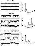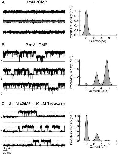 Figure 7. The effect of tetracaine block on single channels. All data shown are from a single patch containing two rod channels recorded at +80 mV. Amplitude histograms were constructed from 30 s of continuous recording. c represents the current present when both channels are closed. Dashed lines represent the currents present when one or both of the channels are open. The position of the lines representing the open states were derived from fits to the histograms and are the same in the presence and absence of tetracaine. Fits to binned data are to an equation for the sum of two Gaussians constrained so that the distribution of open channels follows a binomial distribution with N = 2 (see methods). (A) In the absence of cGMP, both channels are closed. Fits to the histogram are with Po= 0.0 and σ = 0.38 pA. (B) At saturating (2 mM) cGMP, both channels spend most of their time open. Fits to the histogram are with i = 2.74 pA, σ = 0.27 pA, ɛ = 0.25 pA, Po = 0.83. (C) Addition of 10 μM tetracaine causes the channels to spend less time in the open state. Fits to the histogram are with the same values as in the absence of tetracaine except that Po = 0.17. Tetracaine does not cause the single-channel amplitude, i, to change.