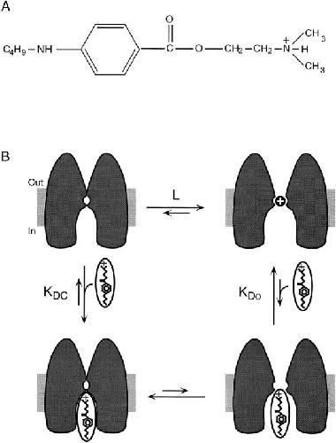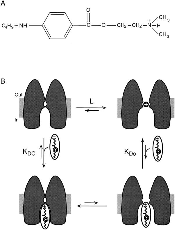 Figure 9. (A) Structure of tetracaine. (B) Model of tetracaine block. The greater affinity of tetracaine for closed channels is envisioned as arising from two distinct mechanisms. Interactions between tetracaine and the inner mouth of the channel pore are seen as leading to tighter binding of tetracaine to closed channels and therefore to stabilization of the closed state. An increase in the width of the pore in the open conformation disrupts these interactions leading to the lower affinity of the open state for the blocker. In addition, the open channel is seen as containing an ion in the pore, not present in the closed channel, which stabilizes the open state. The positively charged ion electrostatically repels tetracaine's positively charged amine group causing tetracaine to bind to the open state with low affinity.