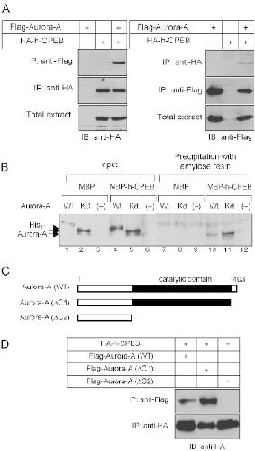 Interaction of h-CPEB with Aurora-A. (A) Interaction of ectopically expressed h-CPEB with Aurora-A in HEK293T cells. Total extracts of cells expressing Flag-Aurora-A, HA-h-CPEB or both proteins were subjected to immunoblot analysis with antibodies to Flag or to HA, as indicated (bottom panels). The same cell lysates were subjected to immunoprecipitation with antibodies to HA or to Flag epitopes and the resulting precipitates were subjected to immunoblot analysis with antibodies to Flag or HA (upper and middle panels). Note that both Flag-Aurora-A (Fig. 1B) and HA-h-CPEB (data not shown) distributed diffusely in cytoplasm. (B) Interaction of maltose binding protein (MBP)-fused h-CPEB and His6-Aurora-A in an in vitro binding assay. MBP-h-CPEB protein or MBP were incubated either with His6-wild-type (WT) or kinase-inactive mutant of Aurora-A (KD), or without Aurora-A (–), and then precipitated with amylose resin beads. Bead-bound proteins were subjected to immunoblot analysis with antibodies to Aurora-A. (C) Schematic representation of wild-type and deletion mutants of Aurora-A. (D) Interaction between h-CPEB and deletion mutants of Aurora-A. Lysates of cells expressing wild-type or deletion mutants (ΔC1 and ΔC2) of Flag-Aurora-A and HA-h-CPEB were subjected to immunoprecipitation as in (A).