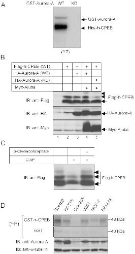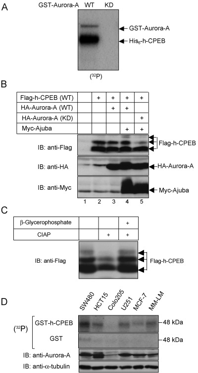 Phosphorylation of h-CPEB by Aurora-A. (A) Phosphorylation of h-CPEB by Aurora-A in vitro. Purified His6-h-CPEB was incubated for 30 min with purified GST-Aurora-A, either wild-type (WT) or the kinase-inactive mutant (KD), in the presence of [γ-32P]ATP. Incorporation of 32P was then visualized by SDS-PAGE and autoradiography. (B) Change in electrophoretic mobility of CPEB by co-expressing Aurora-A. MCF-7 cells were transfected with a combination of an expression plasmid for Flag-h-CPEB, HA-Aurora-A (wild-type or kinase-inactive mutant) and Myc-Ajuba, as shown in the panel. Cell extracts were subjected to immunoblot analysis with antibodies to Flag, HA, or Myc, as indicated. (C) Phosphorylation of Flag-h-CPEB. Extracts of MCF7 cells expressing Flag-h-CPEB, HA-Aurora-A and Myc-Ajuba were incubated with or without 5 unit of calf intestinal alkaline phosphatase (CIAP) and 50 mmβ-glycerophosphate for 2 h at 37 °C, as indicated. The extracts were then subjected to immunoblot analysis with anti-Flag monoclonal antibody. (D) Phosphorylation of h-CPEB in the in-gel kinase assay. Total cell extracts prepared from SW480, HCT15, Colo205, U251, MCF-7 and MM-LM cell lines were tested for h-CPEB phosphorylating activity in gels containing 25 µg/mL of GST-h-CPEB (first panel) or 100 µg/mL of GST (second panel). In parallel, extracts were subjected to immunoblot analysis (IB) with antibodies to Aurora-A (third panel), or α-tubulin (fourth panel) as a loading control.