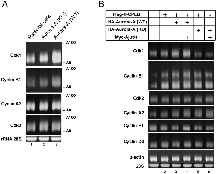 Over-expression of Aurora-A targets cytoplasmic polyadenylation element binding protein and promotes mRNA polyadenylation of Cdk1 and cyclin B1.
