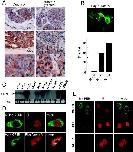 Expression and localization of Aurora-A and CPEB in cancer cells. (A) Immunohistochemical studies of Aurora-A in breast tumor. The frozen sections were prepared from invasive ductal breast carcinomas and immunostained with anti-Aurora-A polyclonal antibodies (left column), or with anti-phospho-Aurora-A (T288P) polyclonal antibodies (right column). Note that high levels of Aurora-A with phosphorylation on Thr288 were found in the cytoplasm. (B) Cytoplasmic distribution of exogenously expressed Aurora-A. HEK293T cells were transfected with plasmid encoding Flag-tagged Aurora-A cDNA, and 48 h after the transfection, cells were fixed and stained with anti-Flag antibodies and labeled with FITC (upper panel). 100 transfected cells were scored for the distribution of Flag-Aurora-A protein; nuclear dominant (N > C), cytoplasmic dominant (N < C) or equally distributed (N = C) (lower panel). (C) Northern blot analysis of h-CPEB in human cancer cell lines. A membrane transferred with 40 µg of electrophoresed total RNA from a human cancer cell was hybridized with 32P-labeled h-CPEB DNA probe. The single 3.3 kb transcript is marked. Ethidium bromide staining for detection of 18S rRNA of the total RNA is shown as a loading control. (D,E) Subcellular localization of h-CPEB. (D) HeLa cells were transfected with plasmid encoding GFP-h-CPEB, and GFP fluorescence (green) with DNA which was stained with propidium iodide (red) and their merged picture is shown (upper panels). NIH3T3 cells were co-transfected with HA-h-CPEB and Flag-Aurora-A, and immunostained with anti-HA (green) or anti-Flag monoclonal antibodies (red) and merged picture is shown (lower panels). Scale bar indicates 10 µm. (E) MM-LM, HeLa and MCF cells were fixed and stained with polyclonal antibodies to h-CPEB and labeled with FITC (green). DNA was counterstained with propidium iodide, PI (red). Scale bar indicates 10 µm.