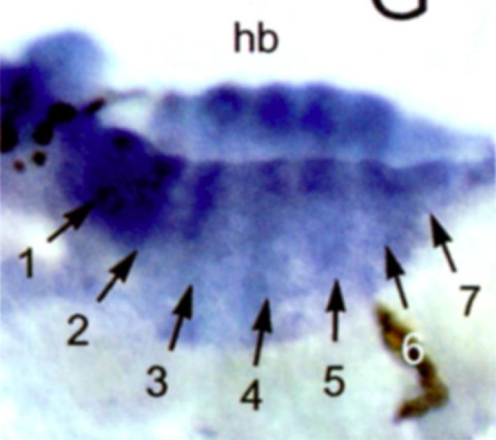 Key: hb=hindbrain, 1-7 =rhombomeres R1-R7 ( rhombomere R8, posterior to R7 is not numbered)