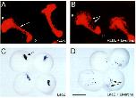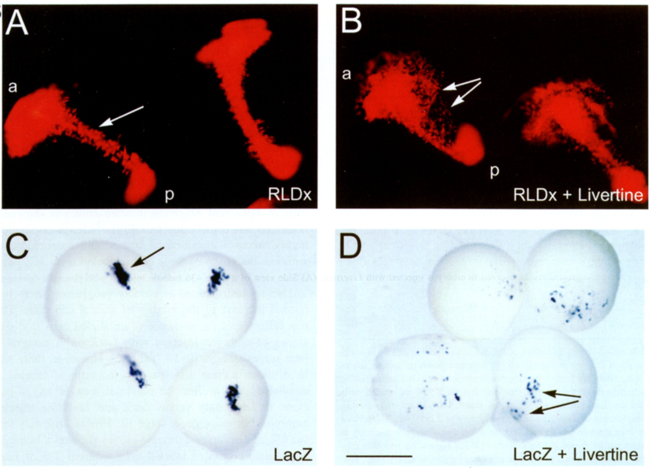 with plasmids driving the expression of LacZ only (C) or LacZ plus Livertine (D) into a small area of the animal pole at the 2-4-cell stage. In both
