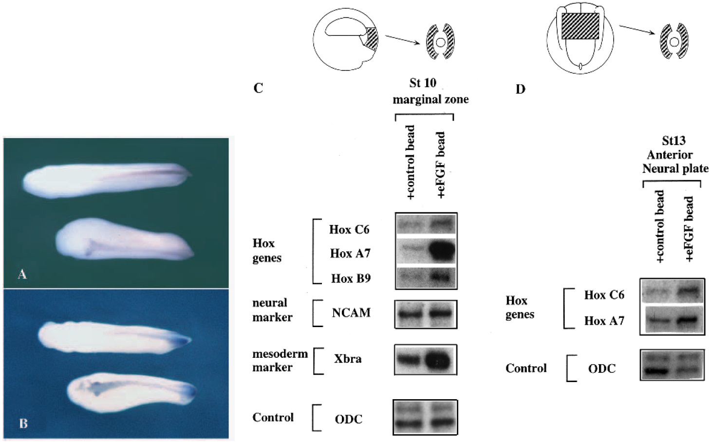 HoxA7 expression in control tailbud embryo (top) or tailbud-stage embryo where an eFGF bead was implanted into the anterior neural plate at