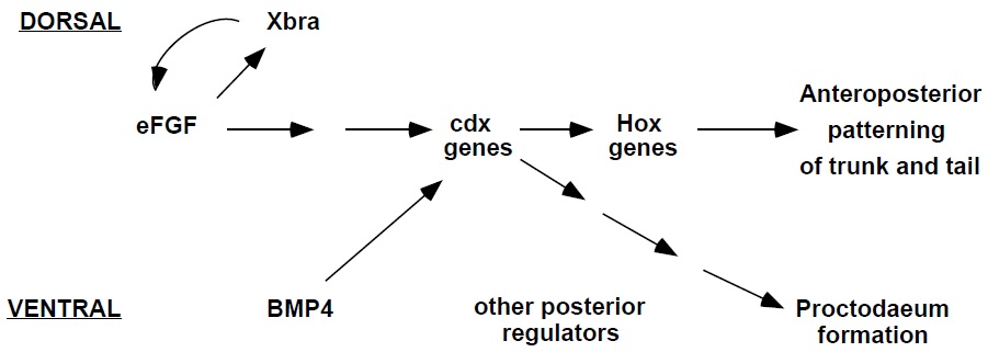 and other signals, such as BMP4, activate ventral expression of cdx and other