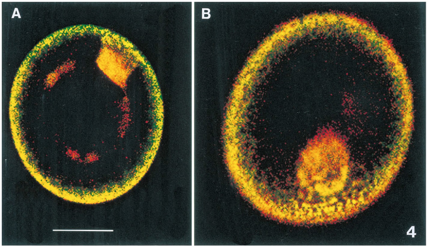 image of fluoroscein-labeled Xlsirt (appear green) and Texas red-labeled Xcat2 (appears red) in the cytoplasm within 1 hr following injection