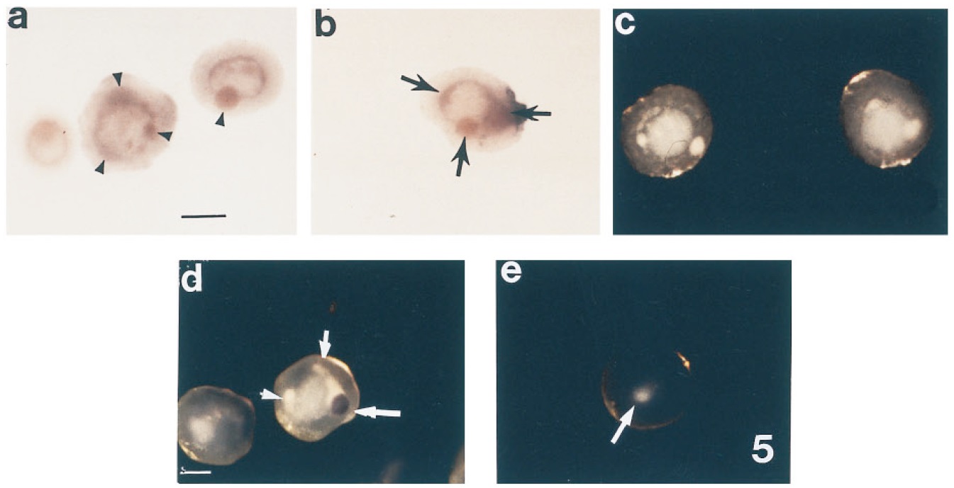arrow points to low level of accumulation); (e) hybridization of Xwnt11 probe to early diplotene stage oocytes (filled arrow points to high
