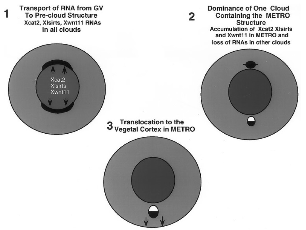 of one of the clouds. Xcat2, Xwnt11, and Xlsirt transcripts are lost in all of the other clouds. The third step is the transport of the RNAs