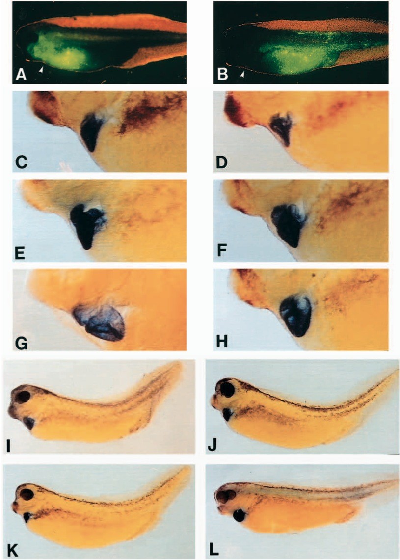 Fig. 2. Overexpression of XNkx-2.3 and XNkx-2.5 in heart progenitors results in enlarged cardiac structures. Embryos injected with lineage tracer plus water, control Mix.2 RNA, XNkx-2.3 RNA or XNkx-2.5 RNA are shown. (A) Fluorescence micrograph of an embryo injected with fluoresceinated dextran in water into the dorsal vegetal blastomere at the 8-cell stage. The heart region is indicated by an arrowhead. (B) Embryo injected as in A into the ventral vegetal blastomere. These embryos are labeled primarily in the posteriorgut and ventralmesoderm. (C-K) In situ hybridization depicting cardiac troponin I expression (blue stain) in stage 37 embryos that were injected into the dorsal vegetal blastomere as in A. (C,K) Water injected (D) Mix.2 injected (E,G,I) XNkx-2.3 injected (F,H,J) XNkx-2.5 injected (L) XNkx-2.5 injected embryo stained by in situ hybridization with XMLC2 probe. The heart is enlarged in XNkx-2.3 and XNkx-2.5 injected embryos (E,F,G,H,I,J,L), but not in water or Mix.2 injected embryos (C,D,K). This is not a non-specific effect of overexpressing homeobox sequences since Mix.2 injected embryos have normal size or small hearts (D). No ectopic cardiac differentiation is detected by in situ hybridization with either XTnIc or XMLC2 probe (I,J,L). Embryos in C-H were photographed at 0 magnification and embryos in I-L were photographed at 0 magnification. The brown color in all embryos is natural pigmentation.