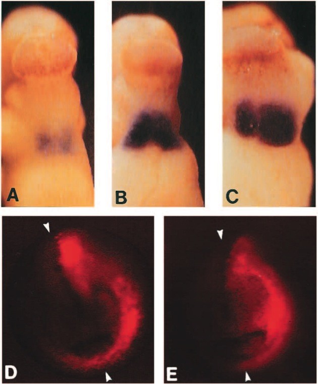 Fig. 3. Increased regions of marker gene expression at early stages of cardiac differentiation. In situ hybridization of stage 26 embryos to detect cardiac troponin I expression indicates that cardiac differentiation begins in two symmetrical regions within the heart field (A) and that these regions are enlarged in XNkx-2.5 and XNkx- 2.3 injected embryos (B,C). (A) Water injected embryo. (B) XNkx- 2.3 injected embryo with symmetrically large troponin expressing regions. (C) XNkx-2.3 injected embryo with asymmetrically large troponin expressing region. The left side which received the injection is larger. Fluorescence microscopy of stage 25 embryos injected into the left dorsal vegetal blastomere at the 8-cell stage demonstrates extensive cell mixing between the left and right sides in the heart region. This cell mixing may result in significant overexpression of injected RNAs on both the left and right sides leading to expansion of the heart field on both sides. (D) Anterior view of stage 25 embryo injected with tetramethylrhodamine-conjugated dextran showing mixing on the ventral side. (E) Anterior view of stage 25 embryo injected as in D but with much less cell mixing. In each case, the plane of the dorsal/ventral axis is indicated by opposing arrowheads.