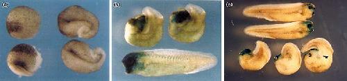 The effect of Xdd1 mRNA on axis-inducing ability of Xwnt8 and Xβcat mRNAs. One ventro-vegetal blastomere of 4â8 cell embryos was injected with (a) 2 pg of Xwnt8 mRNA, (b) 2 pg of Xwnt8 mRNA plus 1.5 ng of Xdd1 mRNA, (c) 0.8 ng of Xβcat mRNA of (d) 0.8 ng of Xβcat mRNA plus 1.5 ng of Xdd1 mRNA.