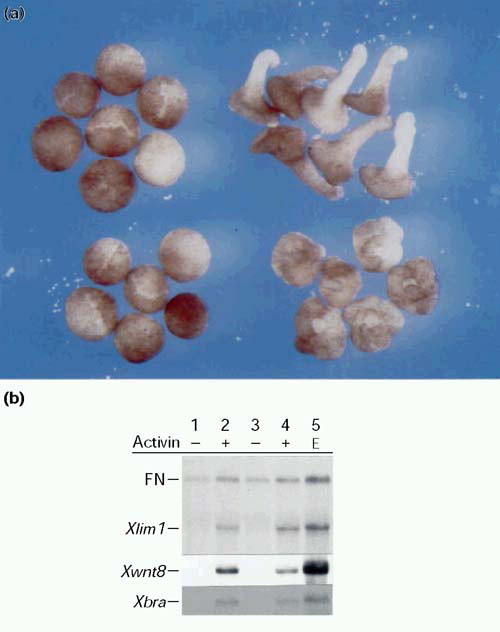 Xdd1 inhibits morphogenetic movements of ectodermal explants stimulated with activin. (a) Morphology of explants at stage 17. Top left: control uninduced explants; top right: control explants induced with activin; bottom left: explants overexpressing Xdd1; bottom right: explants overexpressing Xdd1 and stimulated with activin. No difference is apparent between control uninjected explants and explants injected with Xdd2 (data not shown). (b) Northern analysis of early markers at the early gastrula stage (stage 10.5). Lanes 1,2: uninjected explants; lanes 3,4: Xdd1-injected explants; lane 5, control embryos. Treatment of explants with activin was as indicated. Total RNA was prepared when control embryos reached stage 10.5 Xbra is a general marginal zone marker. Xlim1 marks dorsal, and Xwnt8 marks ventrolateral marginal zone. Fibronectin (FN) mRNA is a loading control.
